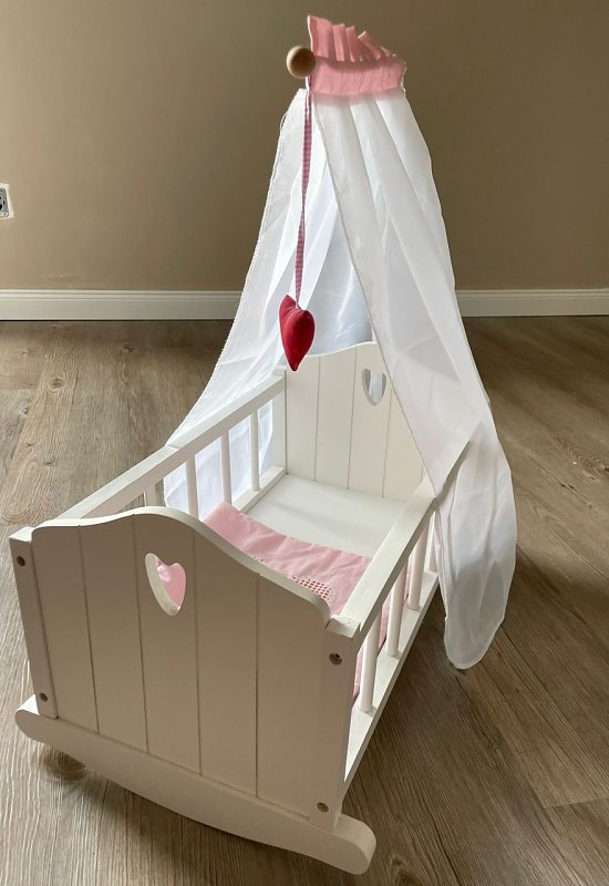 Verkaufe eine süße Puppenwiege aus weißem Holz mit liebevollen Details. Die Wiege ist perfekt für kleine Puppenmamas geeignet.• Weißes Holz mit herzförmigen Verzierungen