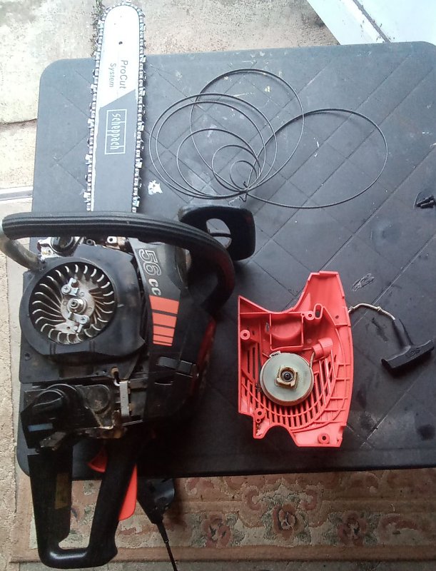 Vorderseite  (Foto: ) Ich biete hiermit eine Motor Kettensäge mit 56 ccm und ca 4 PS. Sehr leistungsstark. Aus Nachlass. Wenig genutzt von älterem Herrn. Problem: die Rückzugfeder für das Anlassseil ist herausgesprungen, kann man wieder einfädeln... Ich brauche sie nicht. Deshalb gebe ich sie gerne an Fachleute/ Bastler ab. VB 80 Euro.