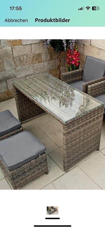 Balkonmöbel (Foto: ) Ich biete Umständehalber neue Balkonmöbel bestehend aus einem Tisch mit Glasplatte,2Sessel mit Kissen und 2 Hocker mit Kissen für 190 € letzter Preis an.Die Möbel sind zu einem Block zusammenschiebbar und eine Abdeckhaube gibts auch dazu.015255776113