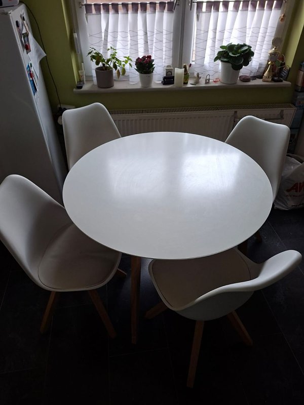 Sitzgruppe (Foto: ) Schöne Sitzgruppe abzugeben. 1 Tisch, 1,05m Durchmesser. 4 Schalensitze, weiß