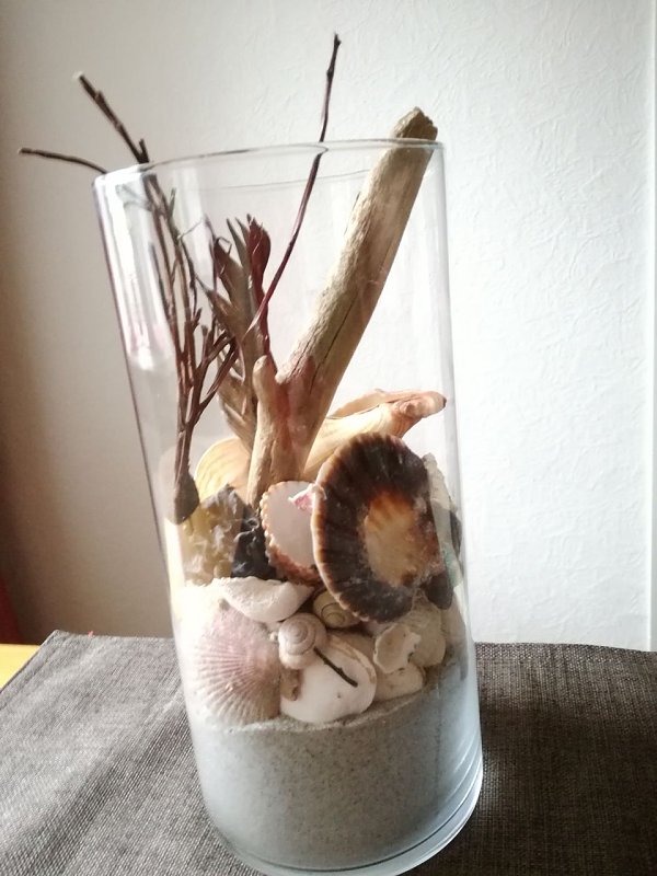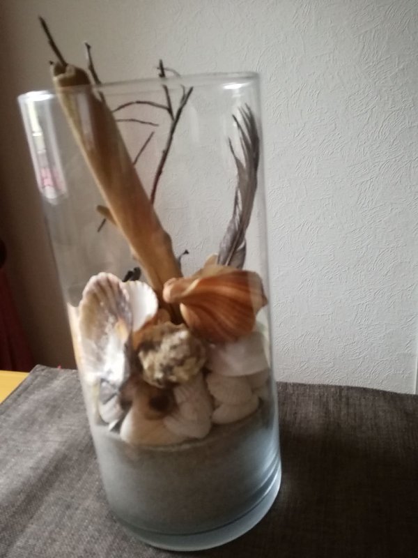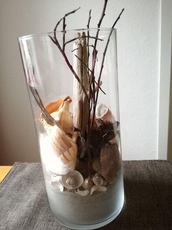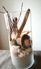 Bestückt mit Sand, Muschel, Treibholz, Feder, Trockenzeug