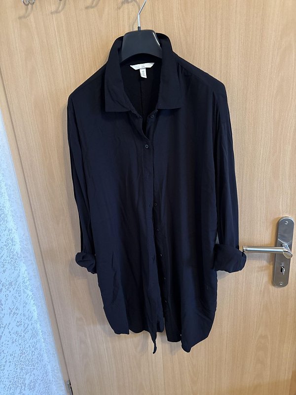 Damenbluse lang, schwarz mit langen Ärmeln zum hochkrempeln , neuwertigGr. L /44/46