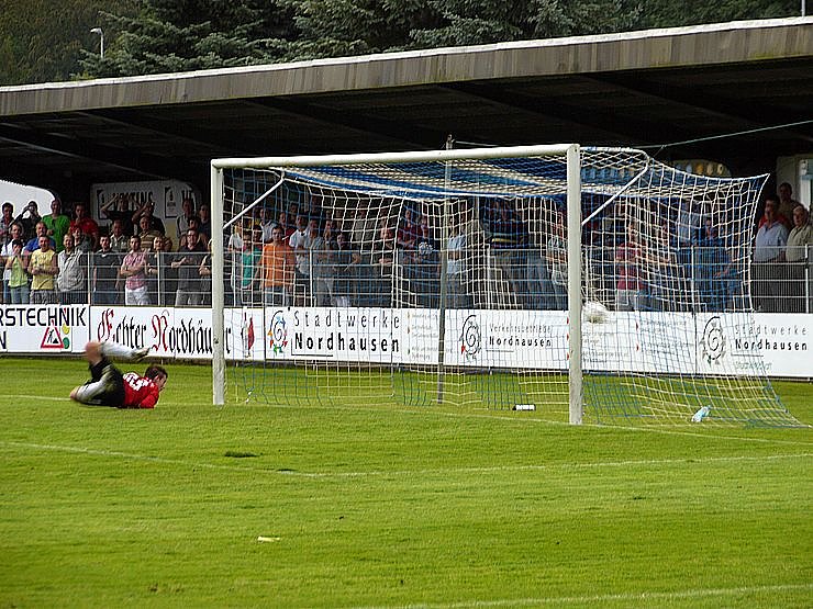 Der erste Angriff der nun anfangs der zweiten Hälfte auf Sparflamme spielenden Nordhäuser wird in der 49. Minute registriert. In der 56. Minute dann ein Nordhäuser Angriff durch Rose auf der linken Seite. Biank hätte sein drittes Tor in diesem Spiel eigentlich machen müssen. Eigentlich, der Ball geht rechts am Tor vorbei.