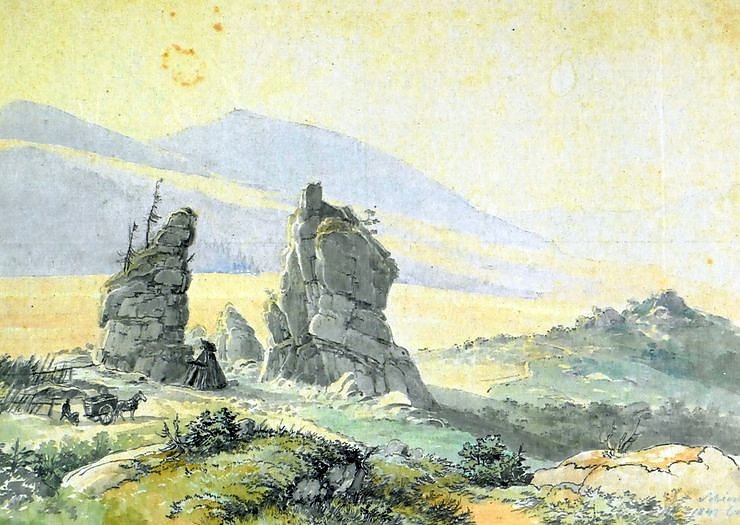 Schnarcherklippen bei Schierke mit Brocken im Hintergrund, 1843Tusche, Feder, aquarelliert, 28,0 x 38,0 cm