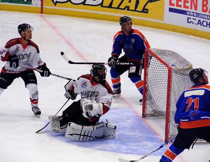 Autor: nnzEindeutig: Der Schuss hat das Tor verfehlt, John Noob, Tobias Bannach, Michael Nason und Jason Visser(von links) haben den Puck aber noch im Auge.