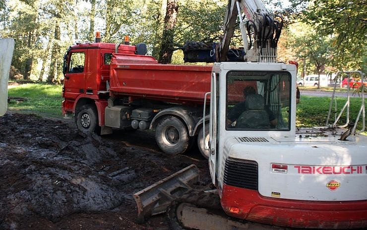 LKW bringen das Schwemmgut auf die Deponie. Eine Zwischenlagerung im Park ist nötig, damit der Schlamm vor dem Transport ausreichend austrocknen kann. Teile der ausgebaggerten Sedimente werden auch dazu benutzt, den Teich an seinen Rändern neu zu modellieren.