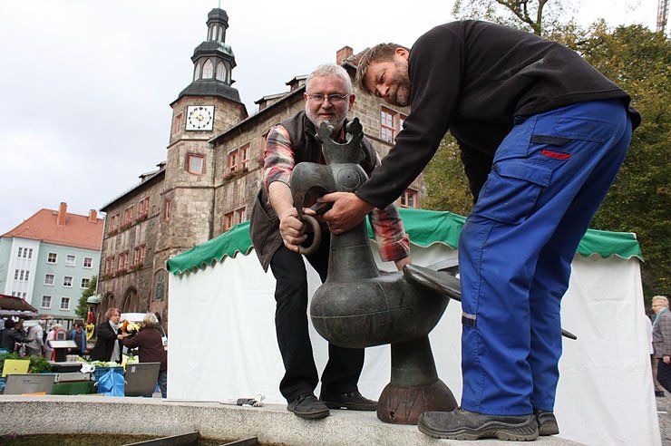 Der Nordhäuser Aar ist auf seinen Platz am Brunnen vor dem Nordhäuser Rathaus zurückgekehrt - nach rund einem Monat Abwesenheit. Metallgestalter Lutz-Martin Figulla und Hubert Nebelung vom städtischen Bauhof haben die Vogelfigur jetzt angebracht.