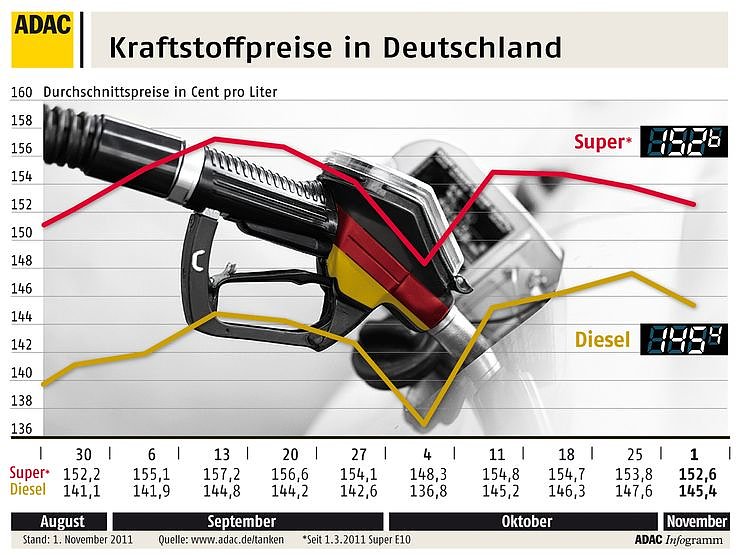 Deutschlands Autofahrer dürfen zum Monatswechsel leicht aufatmen. Die Preise für Benzin und Diesel sind vom hohen Niveau der Vorwoche leicht zurückgegangen. Wie der ADAC mitteilt, kostet ein Liter Diesel derzeit...