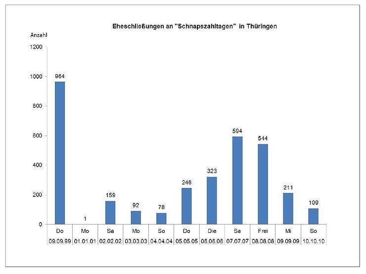 Spitzenreiter unter diesen Schnapszahlterminen ist seit über zehn Jahren der 9.9.99. An diesem Tag wurden in Thüringer Standesämtern 964 Ehen geschlossen. Das war eine wahre Meisterleistung der Standesbeamten, denn von den 1 763 Eheschließungen im September 2009 fand jede zweite am 09.09. statt.