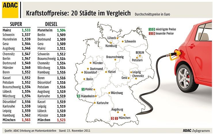 Die höchsten Preise für Diesel müssen derzeit die Münchner Autofahrer bezahlen. In der bayerischen Landeshauptstadt kostet ein Liter 1,523 Euro. Die günstigste untersuchte Stadt für Dieselfahrer ist derzeit Mannheim. Allerdings ist dort ein Liter des Selbstzünderkraftstoffs mit 1,504 Euro auch nur um 1,9 Cent billiger als in München.