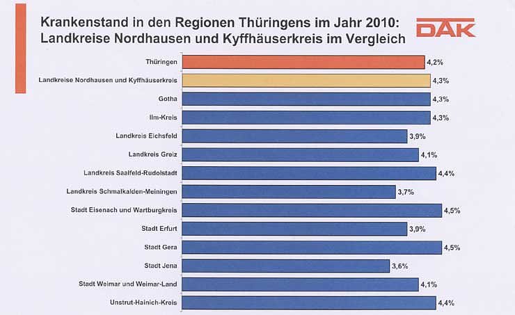 Der Krankenstand im Landkreis Nordhausen und Kyffhäuserkreis ist 2010 gestiegen, so begann Uwe Burkhardt, der Leiter Service der DAK-Krankenkasse für Thüringen seine Ausführungen. Die Ausfalltage aufgrund von Erkrankungen nahmen um 0,2 Prozentpunkte zu. Mit 4,3 Prozent liegt die Region jetzt knapp über dem Landesdurchschnitt von 4,2 Prozent. Damit waren an jedem Tag des Jahres von 1.000 DAK-versicherten Arbeitnehmern 43 krankgeschrieben. Der niedrigste Wert im Land wurde mit 3,6 Prozent in Jena verzeichnet. Den höchsten Wert hatten die Stadt Gera sowie Eisenach und der Wartburgkreis mit je 4,5 Prozent.