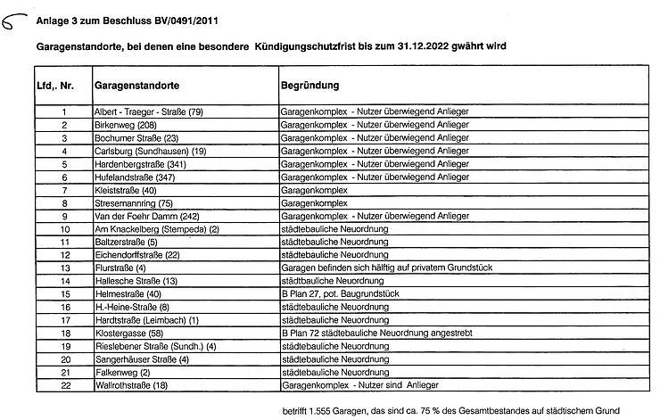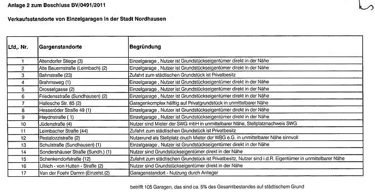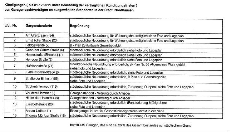 In der nächsten Sitzung des Nordhäuser Stadtrates soll nun ein Beschluss gefasst werden, der die Kündigungen von 419 Garagen an 15 Standorten in Nordhausen vorsieht. Und zwar zum 31. Dezember 2011 (siehe Foto und Anlage). Das sind rund 20 Prozent der Gesamtbestandes auf städtischem Grund.