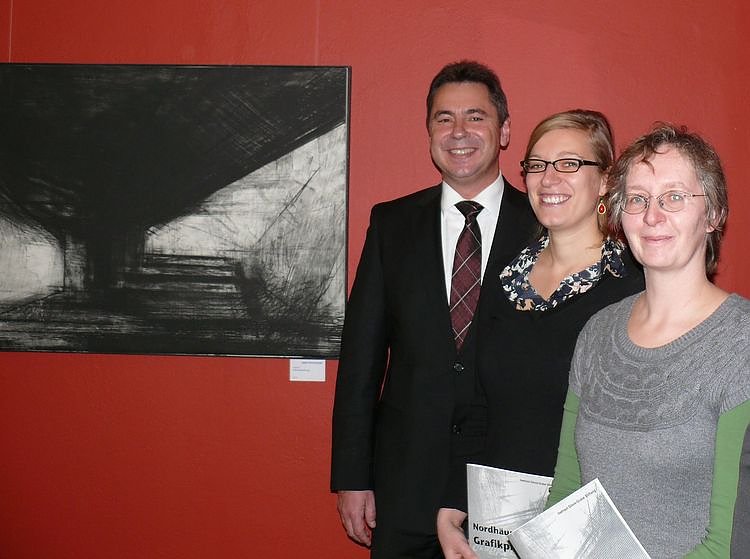Der Nordhäuser Grafikpreis wurde 2011 an Karin Pietschmann verliehen. Heute lebt die gebürtige Arnstädterin in Leipzig und ist dort nach ihrem Meisterschülerstudium freischaffend tätig. Sie überzeugte die Jury mit ihren großformatigen Kaltnadelradierungen. Drei der ausgestellten Werke sind auf Leinwand aufgezogen und stechen durch die starken Kontraste sofort ins Auge.