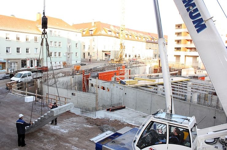 Ein Riesen-Kran bestimmte heute Vormittag das Bild auf der Baustelle. Er hatte mehrere Betontreppen in den Rohbau gehoben mit einem Gewicht zwischen fünf und knapp sieben Tonnen. Sie werden später in die Tiefgarage führen und müssen jetzt eingebaut werden, bevor die Decke vom 1. Untergeschoss der Tiefgarage für die Schalung geschlossen wird, sagte Sabine Och vom städtischen Bauamt, die das Projekt betreut. Nach dem Ende der Frostperiode soll dann im kommenden Jahr diese Decke betoniert werden.