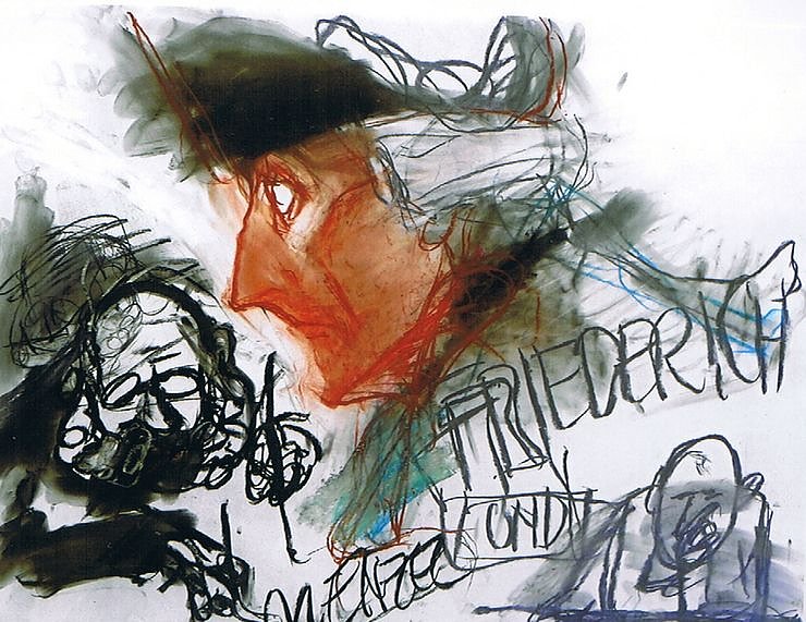 Da am 24. 1. 2012 Friedrich II. von Preußen 300 Jahre wird, gibt es in der Dichterstätte eine kleine Ausstellung über ihn, der sich ja auch als Philosoph, Musiker und Schreibender einen Namen machte. Eines der Bilder stammt von Gerd Mackensen, der den Alten Fritz mehrfach abgebildet hat. Dieses Kunstwerk entstand 2011 aus Anlass der Menzel-Ausstellung im Kunsthaus Meyenburg.