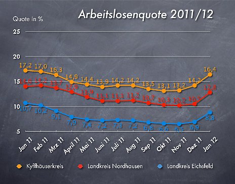 Landkreis NordhausenDie Arbeitslosigkeit ist von Dezember auf Januar um 925 auf 5.214 Personen gestiegen. Das waren 541 Arbeitslose weniger als vor einem Jahr. Die Arbeitslosenquote auf Basis aller zivilen Erwerbspersonen betrug im Januar 11,5%; vor einem Jahr belief sie sich auf 12,6%. Dabei meldeten sich 1.687 Personen (neu oder erneut) arbeitslos, 339 weniger als vor einem Jahr und gleichzeitig beendeten 757 Personen ihre Arbeitslosigkeit (+43).