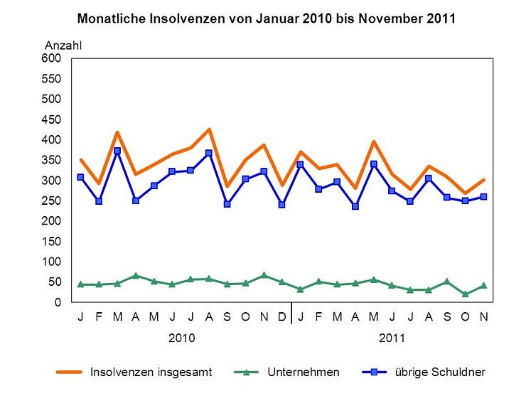 Die Anzahl der Unternehmensinsolvenzen ging im Vergleich der ersten elf Monate 2010 und 2011 um 125 bzw. 21,9 Prozent auf 445 Unternehmen zurück. Die 445 insolventen Unternehmen beschäftigten zum Zeitpunkt des Antrages noch 1 407 Arbeitnehmer. Der wirtschaftliche Schwerpunkt der Unternehmensinsolvenzen lag mit 114 Verfahren nach wie vor im Baugewerbe, gefolgt vom Bereich Handel; Instandhaltung und Reparatur von Kraftfahrzeugen mit 67 Verfahren.