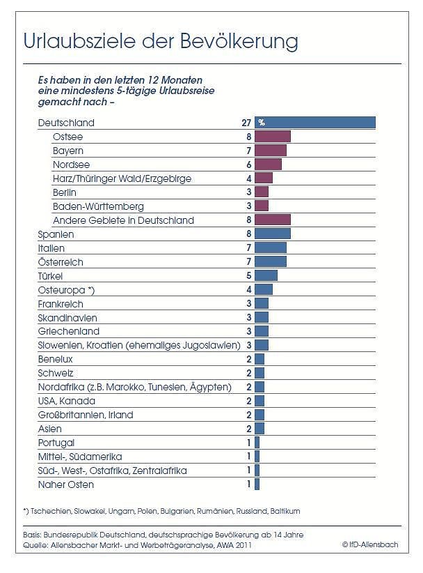 Das beliebteste Urlaubsziel der Deutschen ist dabei das eigene Land. 27 Prozent der Bevölkerung machten Urlaub in Deutschland. Besonders Ost- und Nordsee sowie Bayern stehen hoch im Kurs: 8 Prozent der Bürger verbrachte ihren Urlaub an der Ostsee, 7 Prozent in Bayern, 6 Prozent an der Nordsee. Außerhalb Deutschlands sind vor allem Spanien, Italien und Österreich beliebt, wo jeweils 8 bzw. 7 Prozent aller Bürger ihren Urlaub verbrachten.