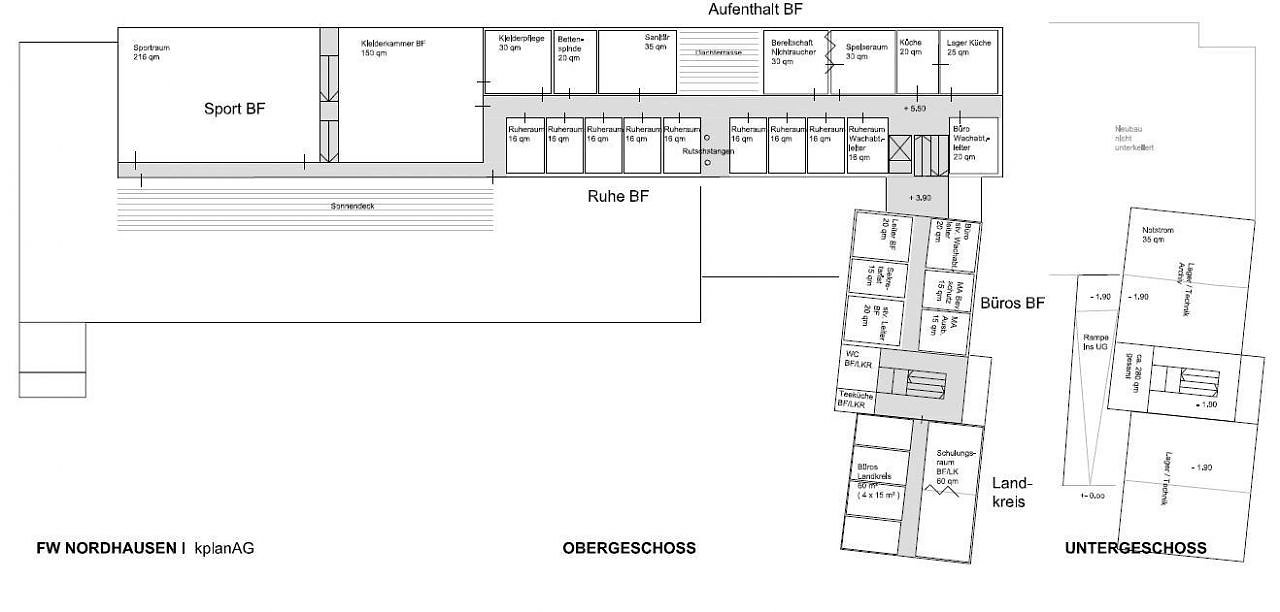 Im Obergeschoss sind unter anderem Kleiderkammer, Sportraum und Ruheraum der Berufsfeuerwehr untergebracht. Das Gebäude des jetzigen Kindergartens wird in den Neubau integriert. Hier entstehen vorwiegend Verwaltungsräume.