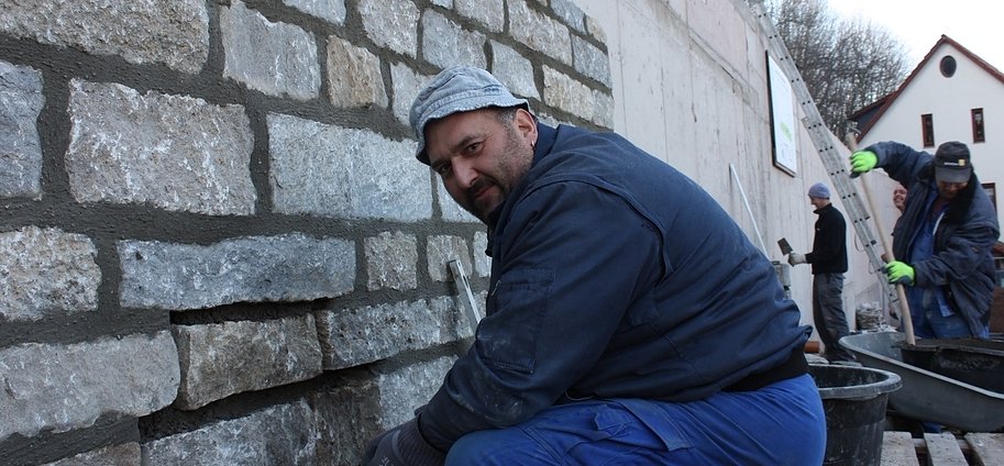 Derzeit sind die Fachleute dabei, an den neu errichteten Mauern eine Verblendung anzubringen aus Kalkstein, das aus dem Thüringer Becken stammt. Die Stützmauern verlaufen unterhalb der historischen Stadtmauer.