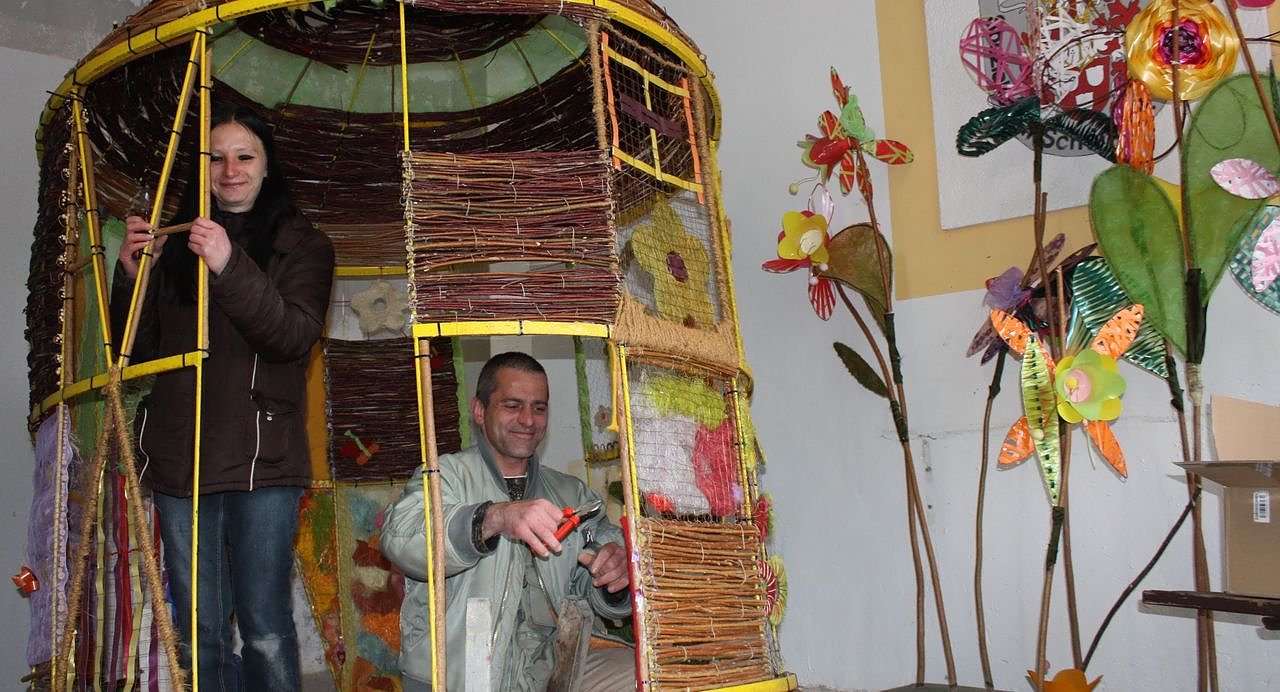 Katrin Reuter und Thorsten Hohe (im Bild) vom VHS-Bildungswerk Nordhausen und Teilnehmer aus Arbeitsgelegenheiten mit Mehraufwandsentschädigung machen sie wieder einsatzbereit. Auch die Dekoration im PetersbergGarten mit den vielen Ostereiern und gebastelten Osterschmuck der Kitas der Stadt Nordhausen erfolgt in Kooperationsvereinbarung mit der Stadt durch das VHS-Bildungswerk.