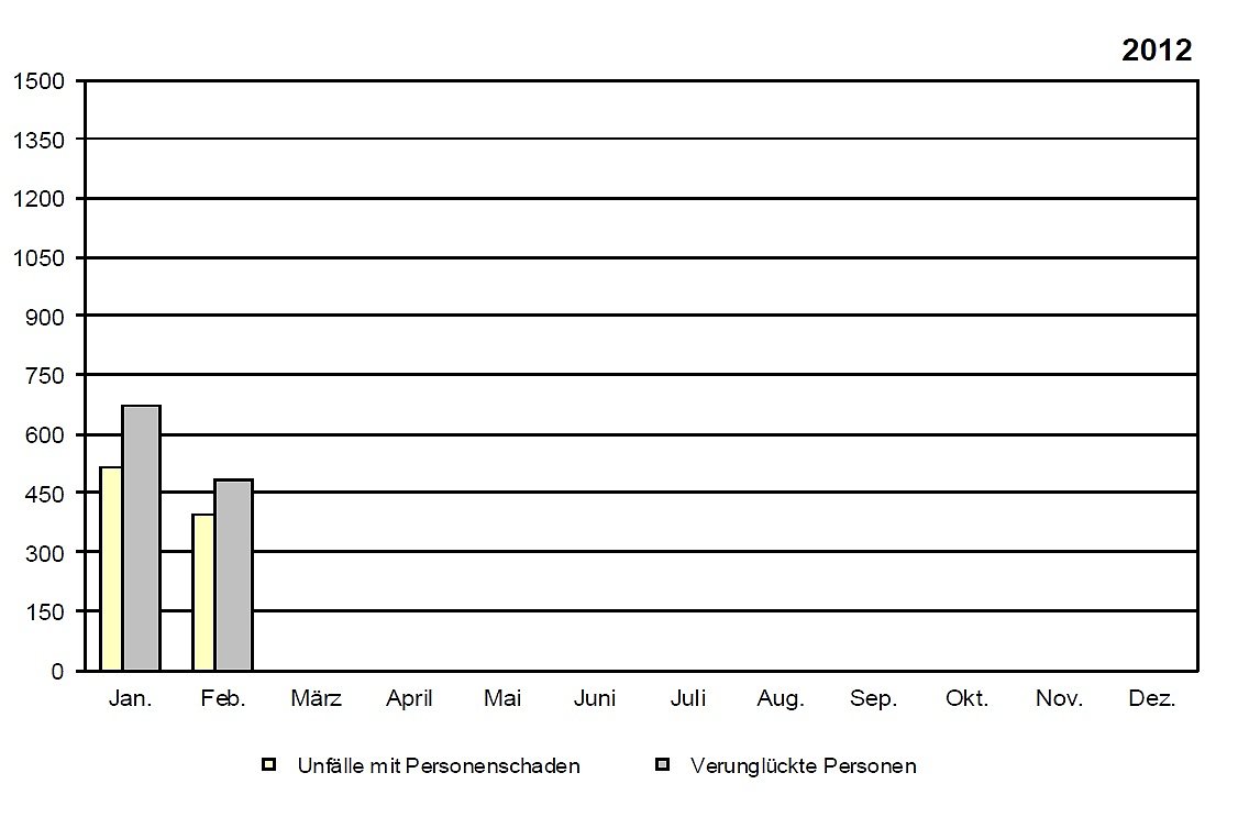 Ebenfalls gesunken ist die Zahl der Leichtverletzten um 61 Personen auf 366 Leichtverletzte. Jedoch wurden bei Straßenverkehrsunfällen 115 Personen schwer verletzt. 8 Personen mehr als im Februar 2011. Von Januar bis Februar 2012 ereigneten sich auf Thüringer Straßen 8 497 Straßenverkehrsunfälle. Das waren 85 Unfälle bzw. 1,0 Prozent mehr als in den ersten beiden Monaten des Jahres 2011. Auch die Zahl der Verunglückten erhöhte sich um 27 auf 1 153 Personen.