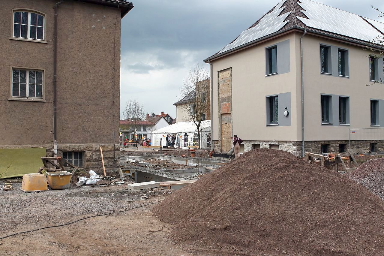 Zwischen der alten Turnhalle, die ebenfalls saniert wird, und dem inzwischen sanierten Schulgebäude soll ein Verbindungsbau entstehen. Heute wurde dazu der Gurndstein gelegt.