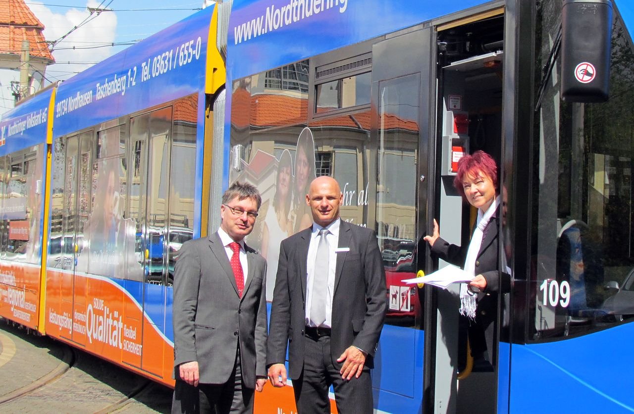 Die Nordthüringer Volksbank kleidete den neuen Triebwagen mit auffallender Werbung ein. Vorstand Peter Herbst übergab die Bahn Anfang der Woche an die Geschäftsführer der Verkehrsbetriebe. Wir freuen uns über die Zusammenarbeit auf diesem Gebiet, so Gabriele Schuchardt und Mathias Hartung.