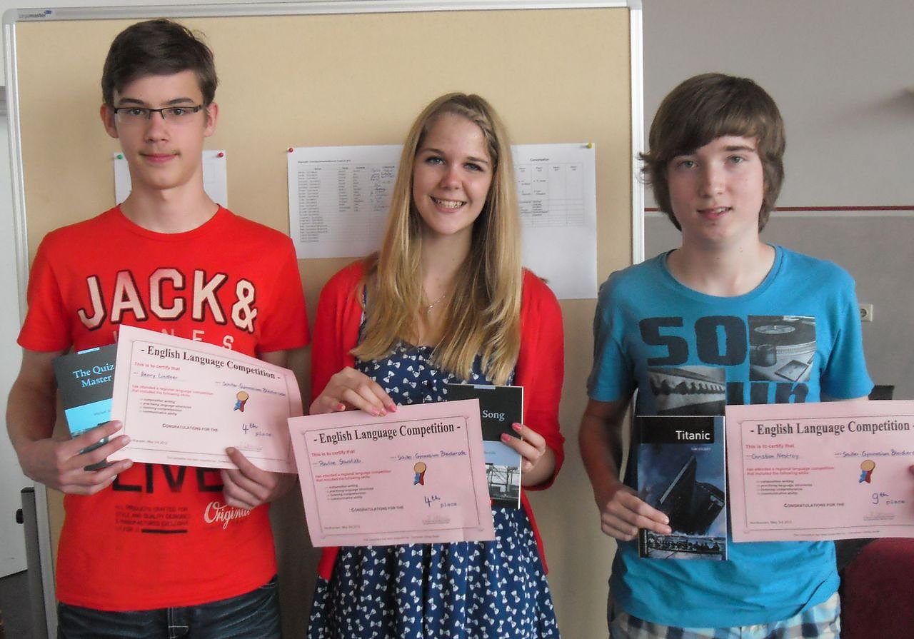 Mit gleicher Punktzahl teilten sich seine Mitschülerin Eva Messer und Pauline Werther vom Herder-Gymnasium den 2. Platz. Aber auch alle anderen Teilnehmer/innen konnten dank der Unterstützung durch den Thüringer Philologenverband, den Cornelsen-Verlag und das Buchhaus Rose Nordhausen mit Gutscheinen und Buchpreisen ausgezeichnet werden. Ein besonderer Dank gilt den Gastgebern sowie den begleitenden Lehrern für ihre engagierte Arbeit, die zum Gelingen des Wettbewerbs beitrug.