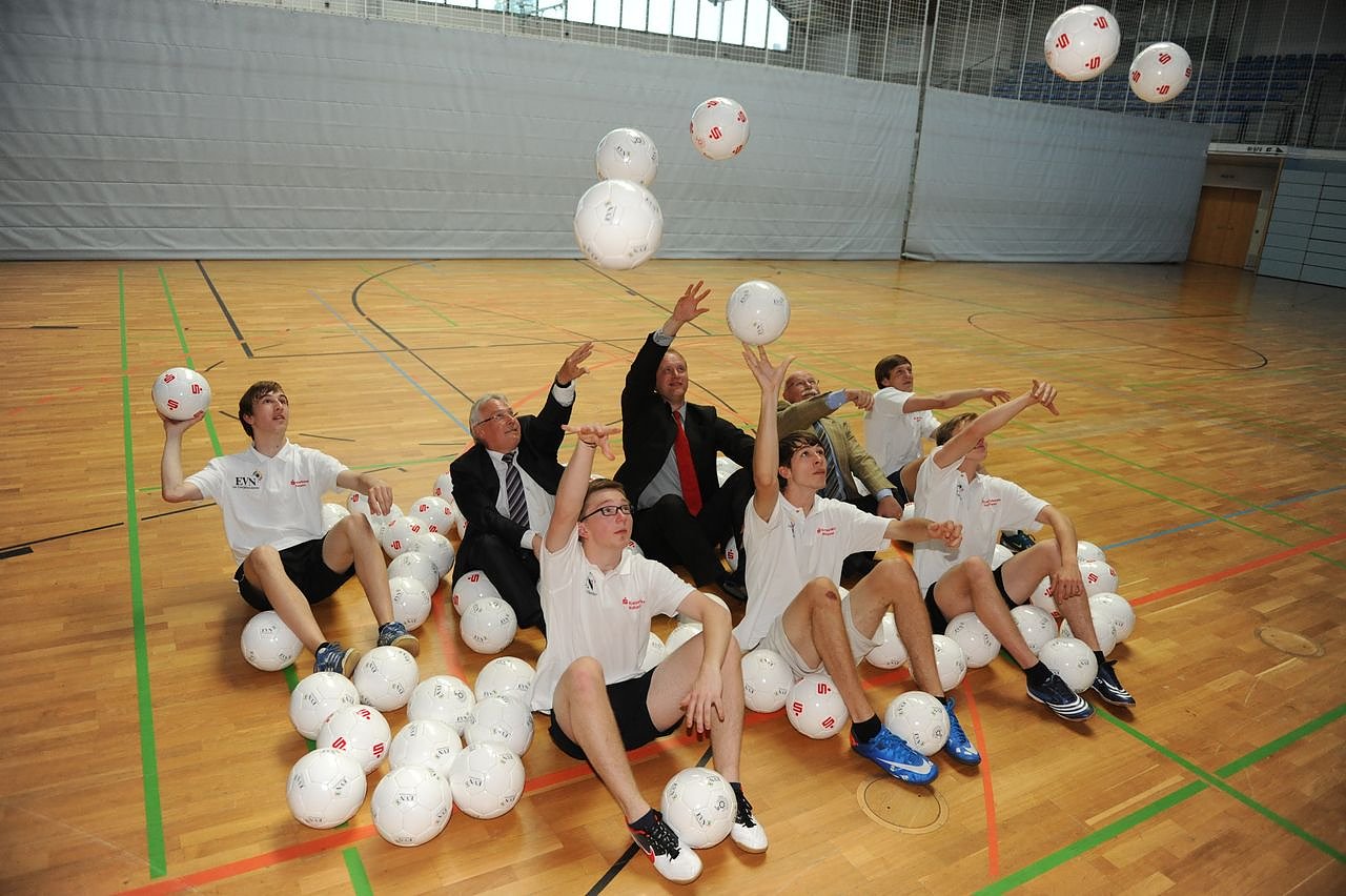 Autor: nnzDie Förderer des Nordhäuser Schulsports, vertreten durch den Abteilungsleiter Sebastian Gräser von Kreissparkasse Nordhausen (Mitte) und die Geschäftsführer der Energieversorgung Nordhausen, Hans-Peter Dörflinger und Rolf Göppel (v.r.n.l.) übergaben den Sportlehrern aller 35 Schulen des Landkreises Nordhausen 100 Bälle für den Schulsport.