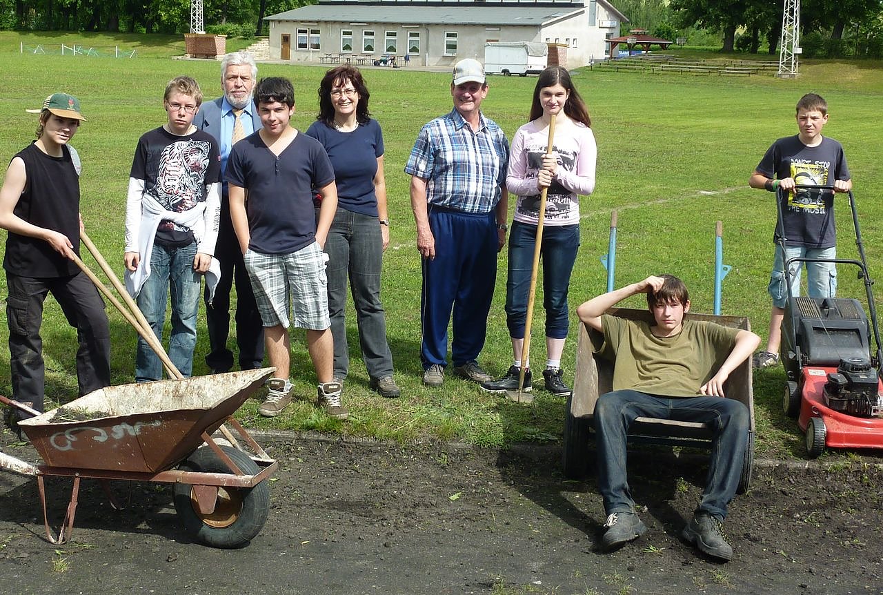 Unter Anleitung ihrer Lehrerin Martina Hinneburg (5.v.l.) haben die Schüler auf dem Bleicheröder Sportplatz die Pflege der Anlagen vorgenommen. So wurde das Unkraut von beiden Weitsprunggruben entfernt, die 100-m-Strecke und die Aschenbahn hergerichtet und Rasen gemäht. Damit wurden die Vorbereitungen für das Sportfest am 29. Juni unterstützt.