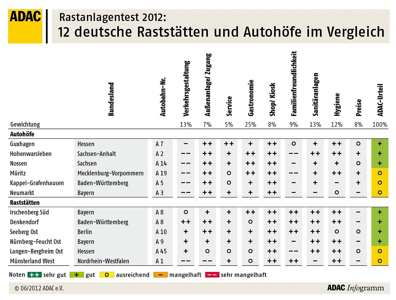 Keine Rastanlage konnte im Gesamtergebnis ein sehr gut erzielen. 33 Mal wurde mit gut bewertet, 27 Mal mit ausreichend, fünf Rastanlagen fielen durch den Test und erhielten ein mangelhaft.