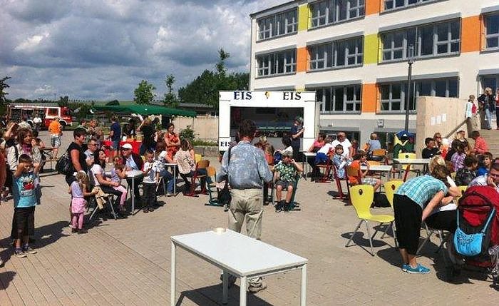 Für ein besonderes kulinarisches Erlebnis einiger Gäste sorgten die Schüler mit ihrem Kochduell. So wurde in der Küche von jedem Team ein drei Gänge Menü gezaubert und der sechsköpfigen Jury präsentiert. Das Ergebnis war sagenhaft knapp und alle haben sich als gute Köche bewiesen. Ein besonderer Dank gilt den zahlreichen Eltern, die den Kuchen für unseren Basar gebacken haben. Er war begehrt bei jung und alt. Ein Dank gilt auch dem Wetter. Die Unterstützung führte zu einem großen Zuspruch unseres Eiswagens. Hier gab es viele leckere Sorten Eis vom Eiscafe Verona in Nordhausen. In der Schulaula gab es Karaoke und gebratene Nudeln mit Krabbenchips. Schöne Spielzüge zeigten die Schachspieler, die dann noch einen Höhepunkt vorbereitet hatten. Auf einem großen Schachfeld wurden die Schüler selbst zur Figur. Gegen 14:30 Uhr ging unser rundum gelungenes Schulfest zu Ende.