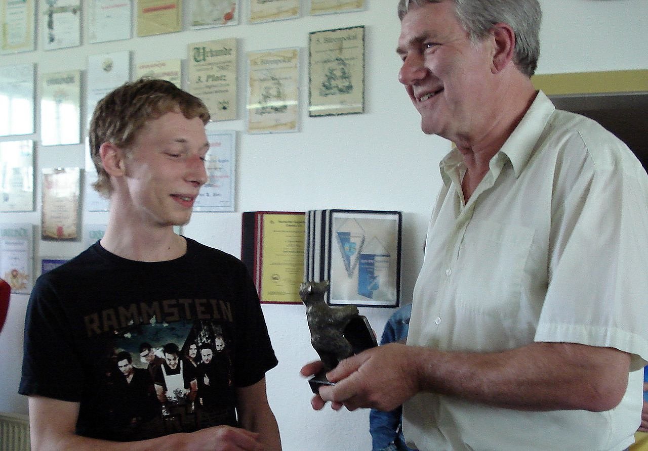 Matthias Stolze (Reifenstein) übernimmt den Pokal aus den Händen des Sollstedter Bürgermeisters Claus Adam (Foto: privat)