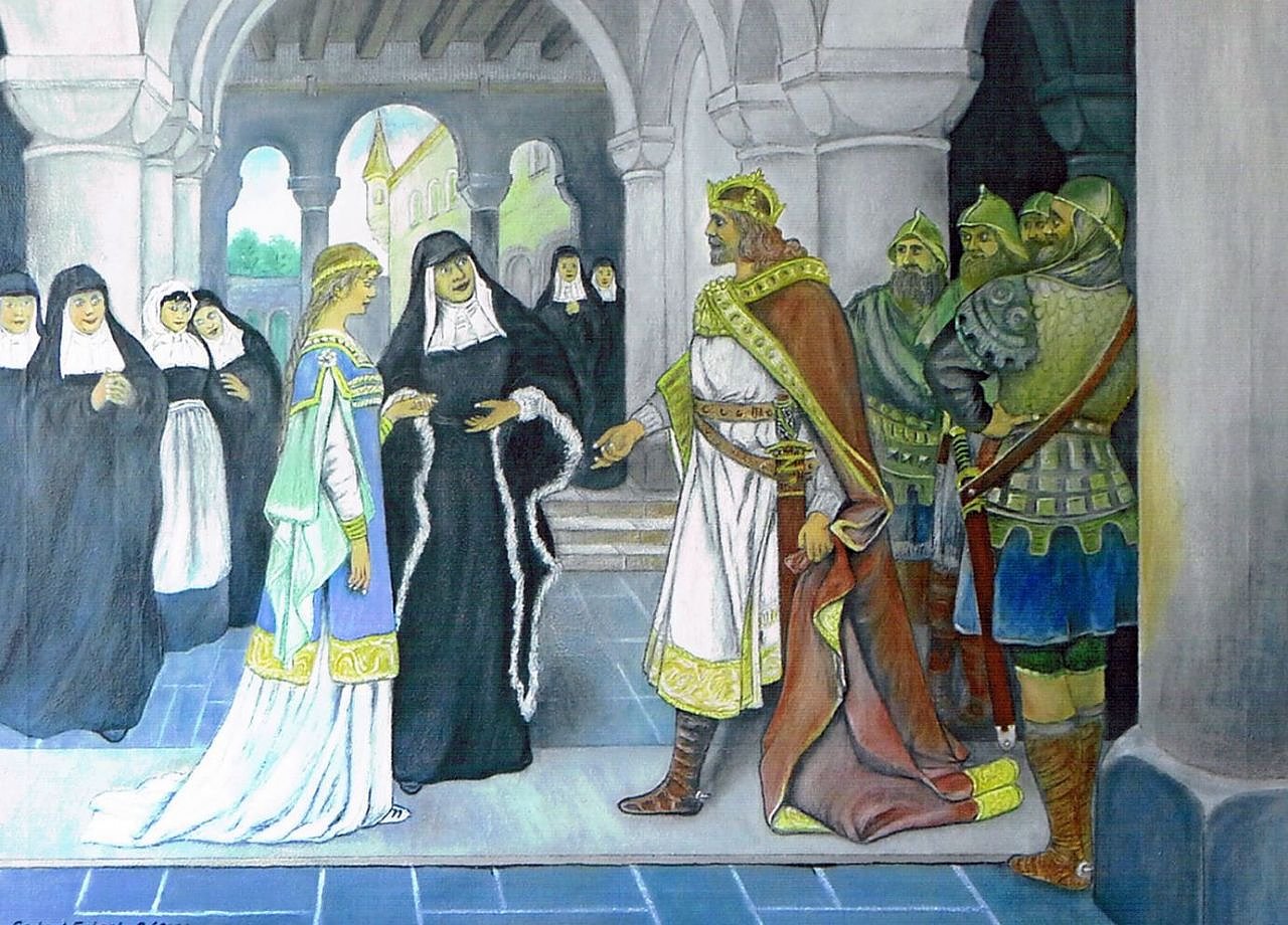 Bereits am anderen Morgen zog Heinrich mit seiner Braut Mathilde heimwärts … und nicht lange nachher wurde in der Pfalz Wallhausen in der goldenen Aue die Hochzeit mit königlicher Pracht festlich begangen. Dies geschah im Jahr 909.