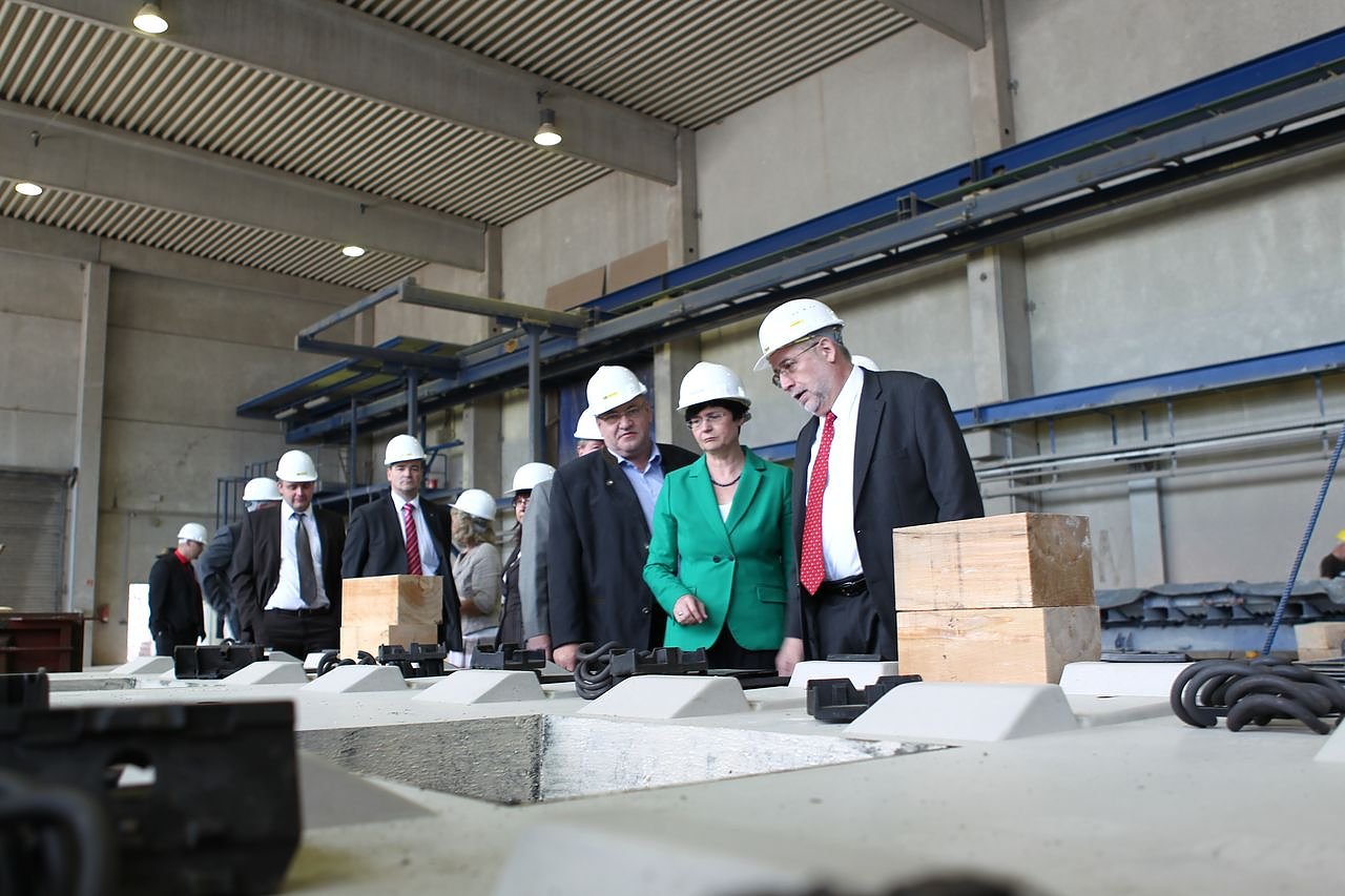 Bei einem Rundgang durch das Unternehmen erläuterte Roland Handrek auch die Gleistragplattenproduktion für die ICE-Strecke von Halle nach Erfurt. Hier werden mehr als 34.000 Platten für eine doppelgleisige Strecke von 90 Kilometer produziert.