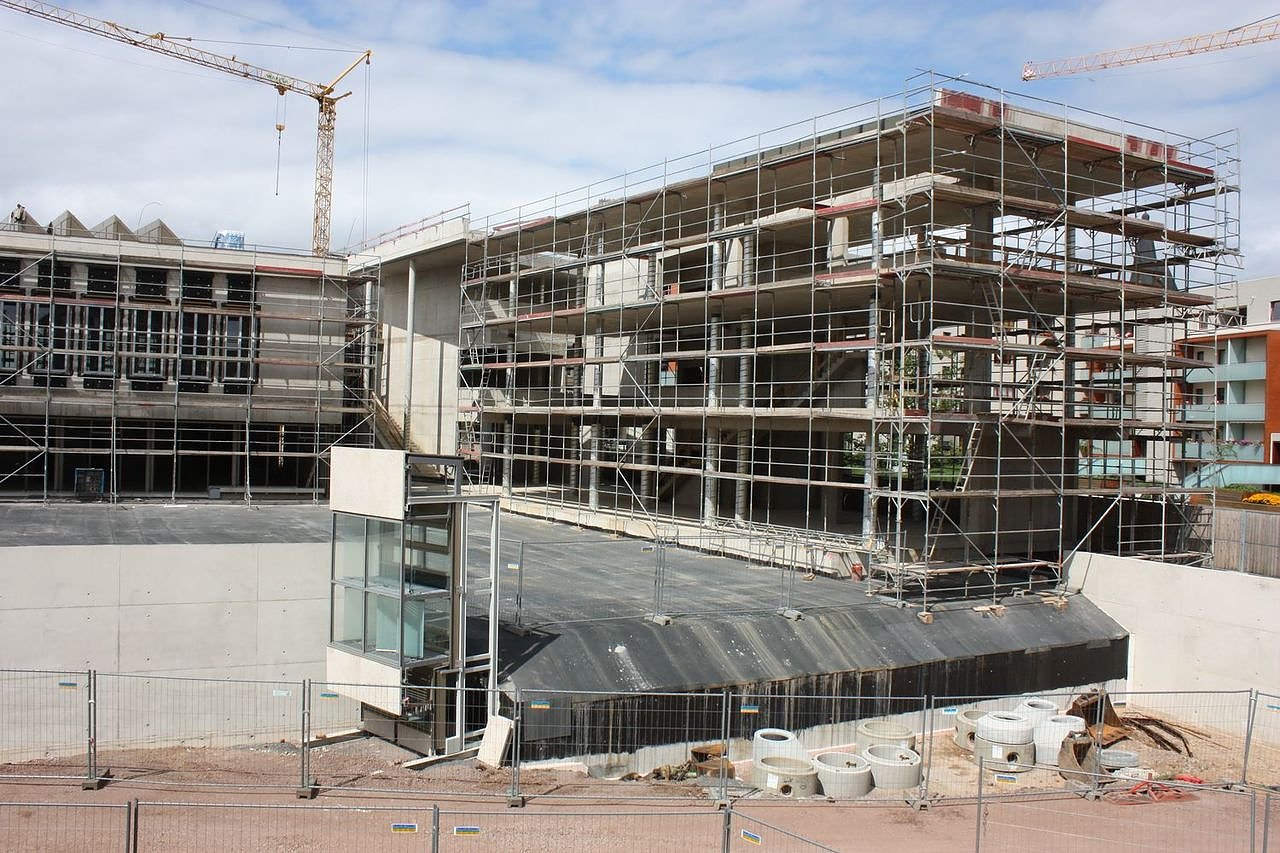 Autor: nnzBlick aus Richtung Rathaus auf die Rückseite des entstehenden Mehrzweckgebäudes. Links der Bürgersaal-Gebäudeteil, rechts das Bibliotheksgebäude. Vor beiden Gebäudeteilen werden Terrassen entstehen.