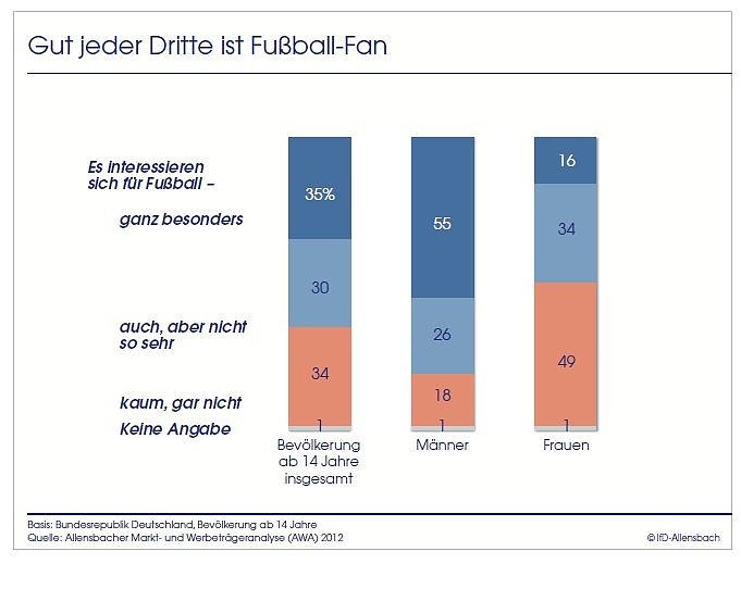 Nicht für jeden geht von Fußball eine besondere Anziehungskraft aus. Aber immerhin gut jeder Dritte in Deutschland hat ein ausgeprägtes Interesse an Fußball - mit großen Unterschieden zwischen den Geschlechtern. 55 Prozent der Männer können angesichts eines stark ausgeprägten Interesses an Fußball zu den Fußball-Fans gezählt werden, von den Frauen sind es nur 16 Prozent, die sich ganz besonders für Fußball interessieren: