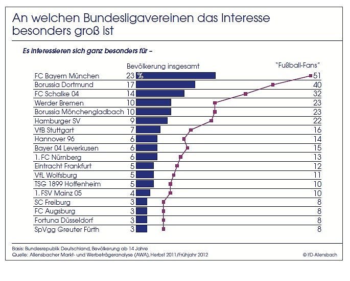 Am sichtbarsten ist dies bei Borussia Dortmund. Vor den beiden letzten, mit dem Gewinn der Meisterschaft gekrönten Bundesliga-Spielzeiten interessierten sich 25 Prozent der Fußballfans für Borussia Dortmund - parallel zum Gewinn der Meistertitel stieg das Interesse unter den Fans auf 40 Prozent. Bei Borussia Mönchengladbach ist das Interesse parallel zum Erfolg in der letzten Saison von 15 auf 23 Prozent gestiegen. Dauerhaft an der Spitze liegt der Rekordmeister FC Bayern München, für den sich - auch ohne Gewinn eines Titels - mit Abstand die meisten fußballbegeisterten Deutschen interessieren.