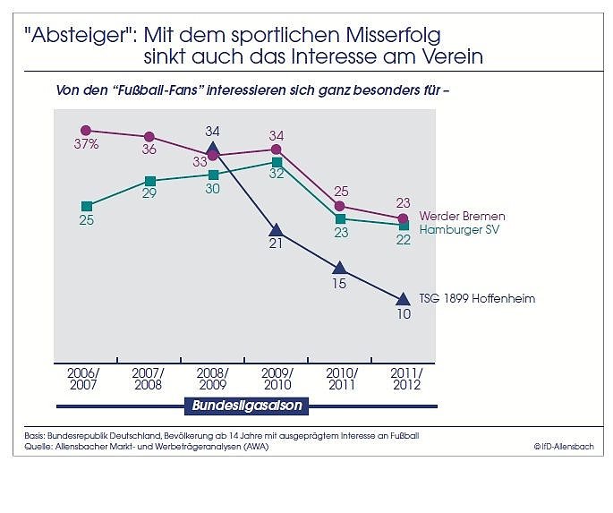 Während das Interesse an den beiden Borussias parallel zum sportlichen Erfolg stark angestiegen ist, ist bei Werder Bremen, dem Hamburger SV sowie besonders deutlich bei TSG 1899 Hoffenheim erkennbar, dass das Interesse der Fußballinteressierten mit ausbleibenden Erfolgen auch deutlich zurückgehen kann. Als Hoffenheim 2008/2009 an mehreren Spieltagen sehr überraschend auf Platz 1 der Tabelle stand, interessierten sich für den damaligen Aufsteiger 34 Prozent der Fußball-Fans. Seitdem ist das Interesse stark zurückgegangen. Aktuell interessieren sich nur noch 10 Prozent der Fußballbegeisterten für den Verein. Einen derartigen Absturz haben die beiden Nordlichter Bremen und Hamburg zwar nicht erlebt, aber auch bei diesen beiden Vereinen hat das Interesse der Fans deutlich nachgelassen.