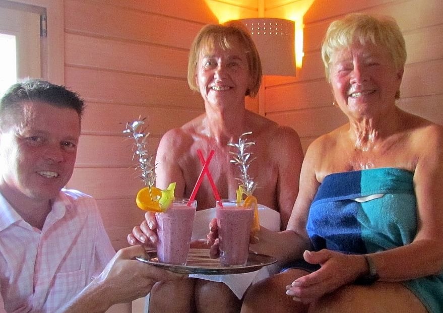 Badehaus-Chef Jens Eisenschmidt begrüßt die ersten Besucher in der neuen Blockhaussauna mit einem Fruchtcocktail. Die Gäste sind begeistert: Einfach ein tolles Ambiente!, so Monika Müller und Annemarie Becker.