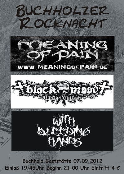 Beginnen wird die Band With Bleeding Hands (Carnage) um 21 Uhr danach folgen Black Mood und Meaning of Pain. Wir denken, dass diese Bands absolute Hochkaräter sind und euren Geschmack treffen. Ein kleines Trostpflaster haben wir natürlich noch für euch…wir gehen mit dem Eintrittspreis herunter auf 4 Euro. Wir freuen uns auf euch und einen schönen lauten Musikabend….ach ja …noch mal der Hinweis an die jüngeren Besucher! Muttizettel nicht vergessen!!!!