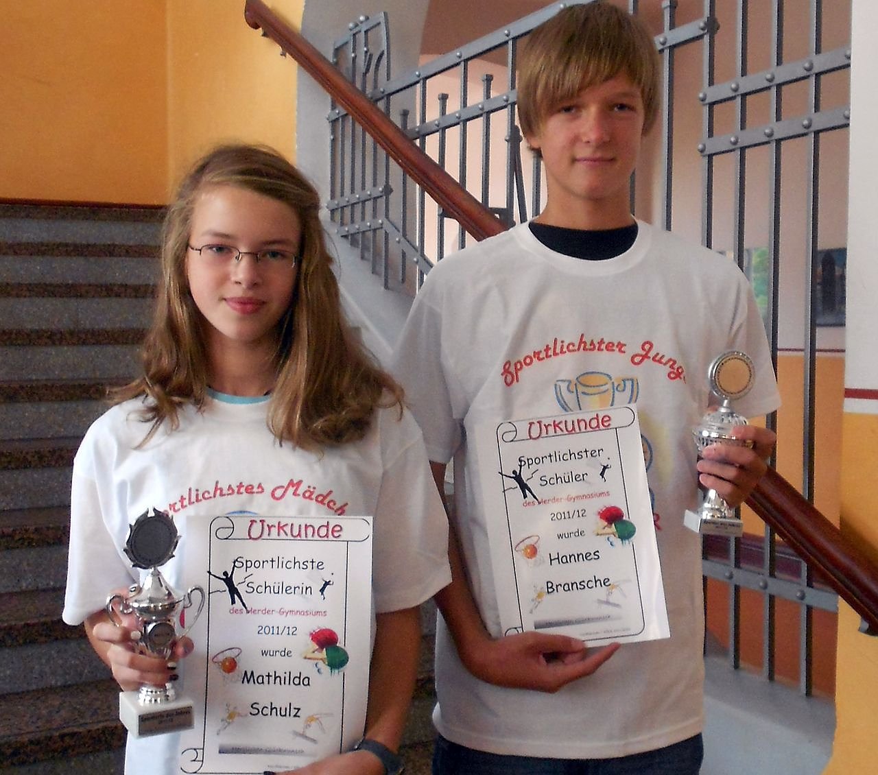 Die Sieger des Jahres 2012 aber heißen Mathilda Schulz und Hannes Bransche (Bild). Als Sportlerin der Klassenstufe 6 errang Mathilda in den Crossläufen des Frühjahrs sowie des Herbstes jeweils den ersten Platz. Achtung erwarb sie sich unter anderem auch mit ihrem 3.Platz im Regionalfinale Leichtathletik, dem Schulrekord im Hochsprung mit 1,45m (AK 13) und den 2.Platz im 2000m-Lauf bei der Landesmeisterschaft.