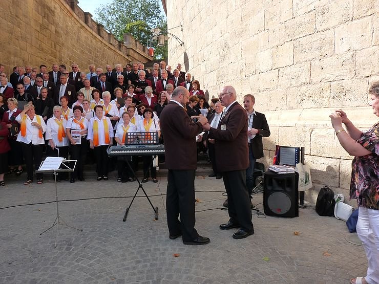 Autor: khhHeute gegen 13.15 Uhr trafen sich dann alle Sängerinnen und Sänger, die an diesem Kreischortreffen teilgenommen hatten, auf der Schlosstreppe neben der "Alten Wache" und sangen gemeinsam in einem Massenchor vier Kanons.