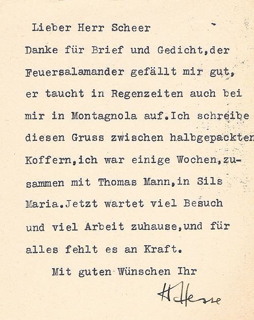 Autor: nnzDass ich im Jahr 2012, in dem sich Hermann Hesses Tod zum 50. Mal jährt, auf einen großen Karton aufmerksam gemacht wurde, in dem die Antwortbriefe bzw. Antwortkarten des Schriftstellers, Dichters und Aquarellmalers Hesse an den Nordhäuser Schriftsteller Adolf Scheer (1897-1984) neben denjenigen an andere Persönlickkeiten des Geistesleben des 20. Jahrhunderts aufbewahrt sind, ist eine glückliche Fügung.