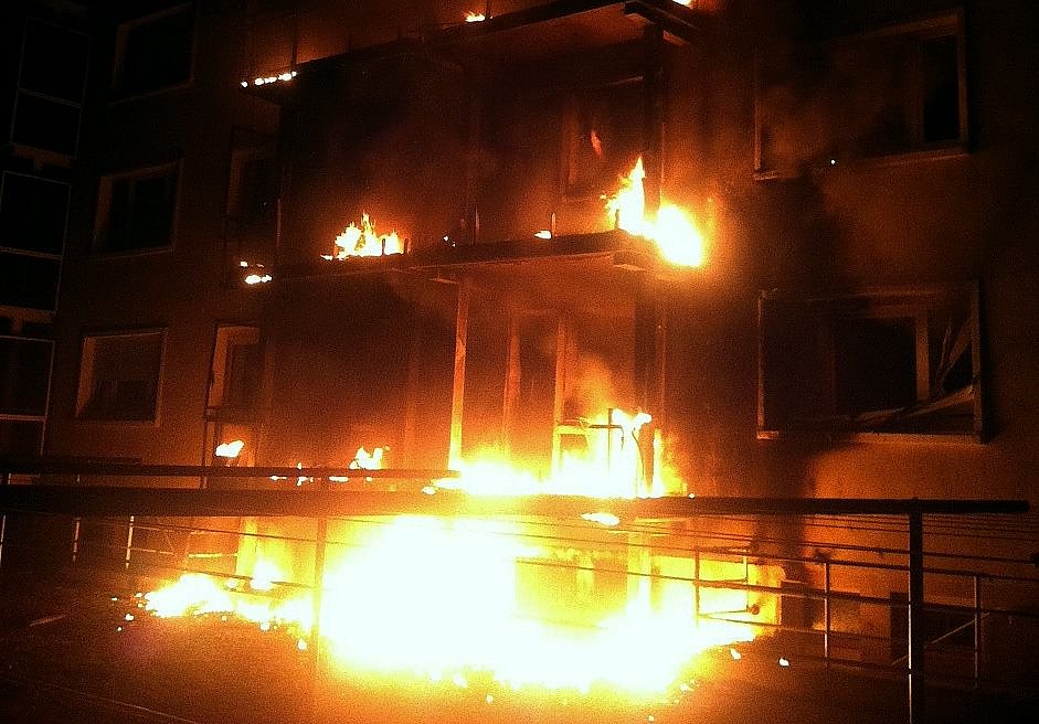 Der Brand war auf einem Balkon des Wohnblocks ausgebrochen. Das Feuer breitete sich rasch auf die anderen Balkone aus. Betroffen sind die acht Balkone zweier Eingänge des viergeschossigen Wohnhauses. Die unmittelbar aneinander grenzenden Balkone sind vollständig abgebrannt. Durch die Hitze barsten viele Fensterscheiben.