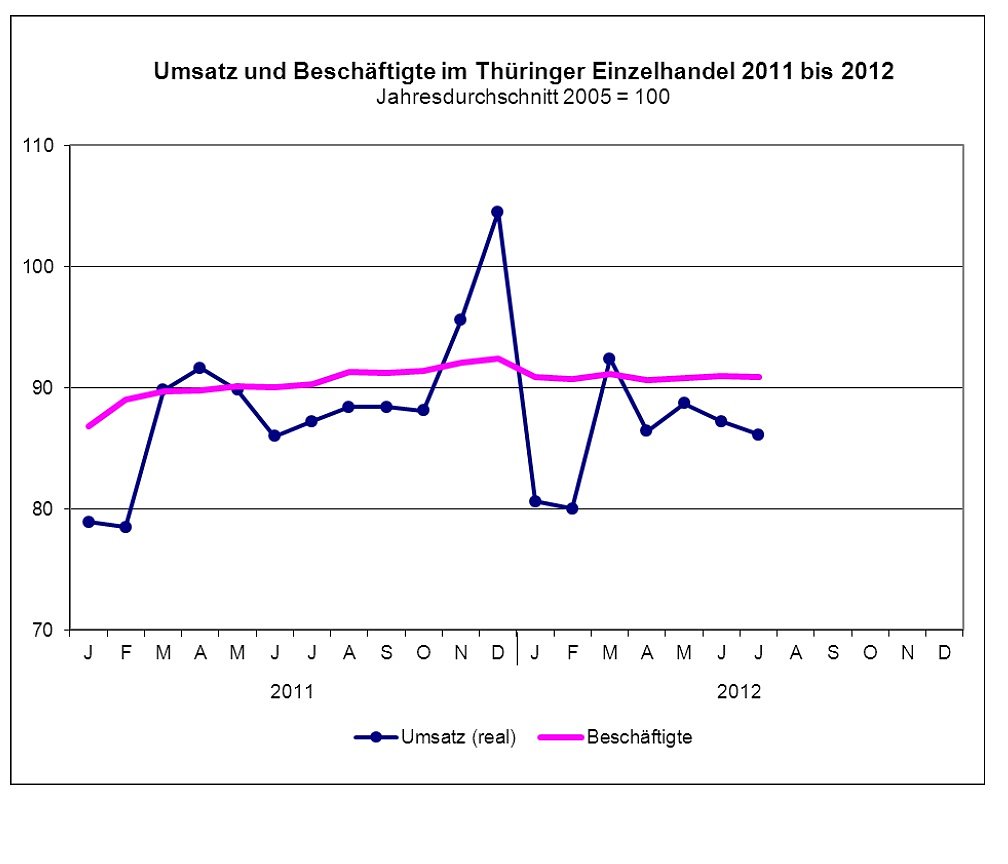 Dabei blieb die Zahl der Vollzeitbeschäftigten im Vergleich zum August 2011 konstant (+0,1 Prozent), während die Zahl der Teilzeitbeschäftigten um 1,1 Prozent anstieg. Im bundesweiten Durchschnitt setzte der Einzelhandel im August 2012 nach vorläufigen Ergebnissen des Statistischen Bundesamtes real (preisbereinigt) um 0,8 Prozent weniger und nominal (d. h. zu jeweiligen Preisen) 1,7 Prozent mehr um.