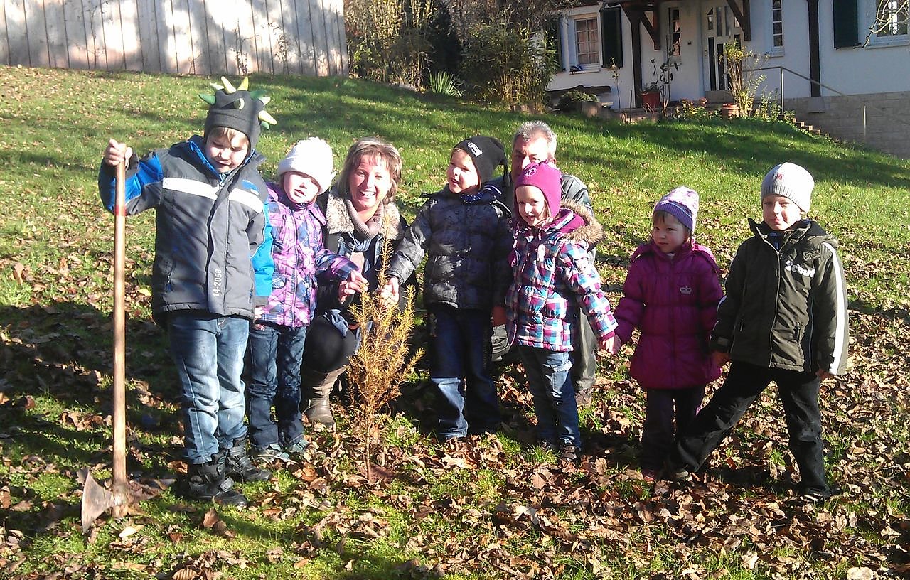 Die Lärche, der Baum des Jahres 2012 fand einen sonnigen Platz zwischen zwei alten Obstbäumen. Die Kinder und der zuständige Revierleiter Weißleder pflanzten selber mit, anschließend wurden die Bäumchen mit ausreichend Wasser angegossen, damit sie gut anwachsen.