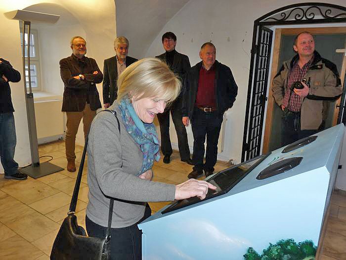 Im Regionalmuseum Bad Frankenhausen wurde heute der von der Naturparkverwaltung Kyffhäuser federführend bearbeitet Touch-InfoPoint offiziell der Öffentlichkeit übergeben. Renate Weinert, die ehemalige Leiterin des Regionalmuseums Bad Frankenhausen und Naturparkbotschafterin drückt im Regionalmuseum Bad Frankenhausen offiziell auf die interaktive Karte. Sie hatte das auch schon bei der Generalprobe getan, noch auf kleine Fehler hingewiesen, aber heute ging alles glatt.