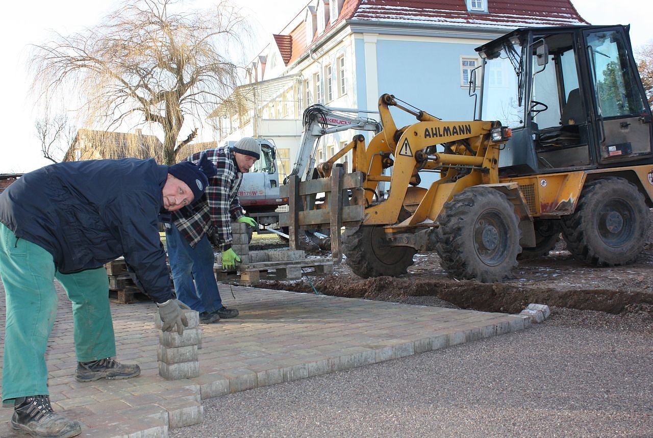 Autor: nnzSven Holzapfel (links)und Jörg Blank von der Firma GAI beim Pflastern der Fläche neben dem Kindergarten, auf der später ein Pavillon und Sitzbänke Platz finden werden.